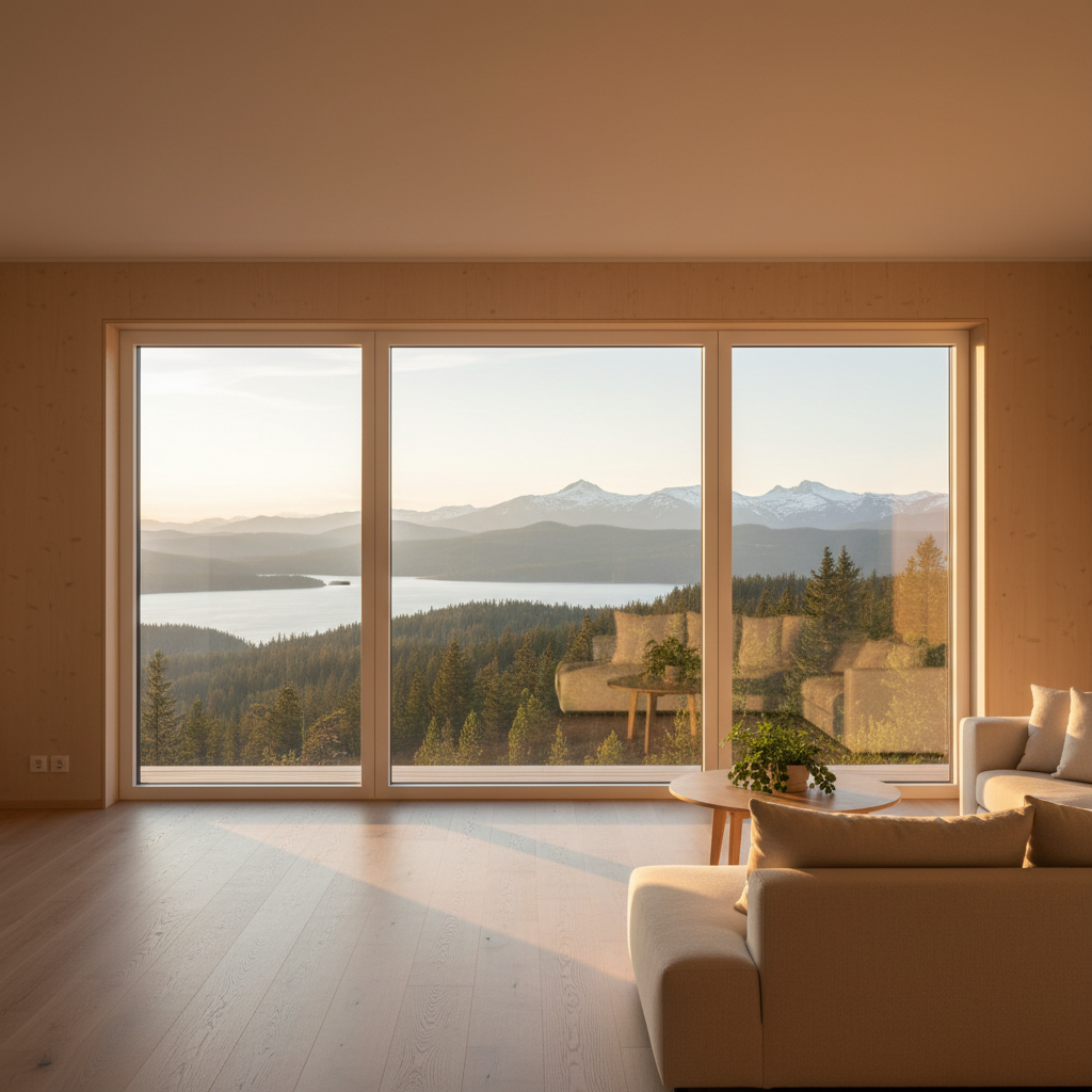 Store vinduespartier: Panoramaudsigt mod hav, skov eller have. Faste vinduer giver maksimal udsigt uden forstyrrende rammer. Kombineres typisk med få åbne vinduer eller en altandør til ventilation.